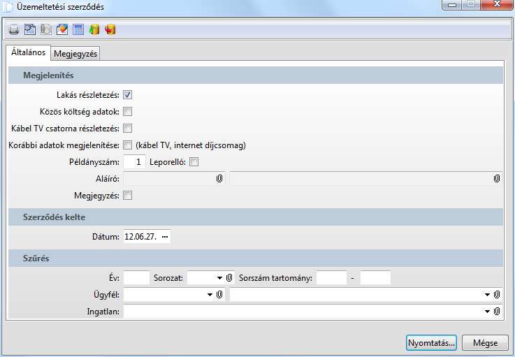 A listával kinyomtathatók az ügyféllel aláírható szerződések. A megadott dátum szerint egy hónap díjaival kerülnek kiszámításra a listára kerülő díjak.