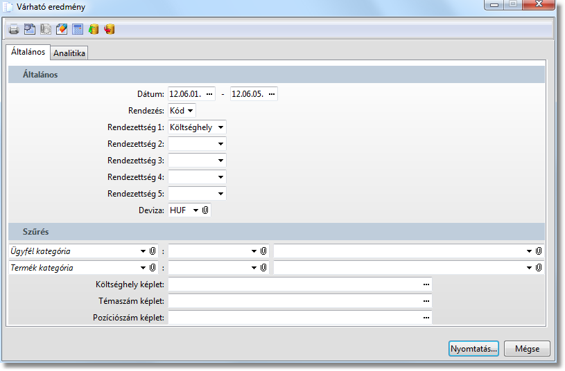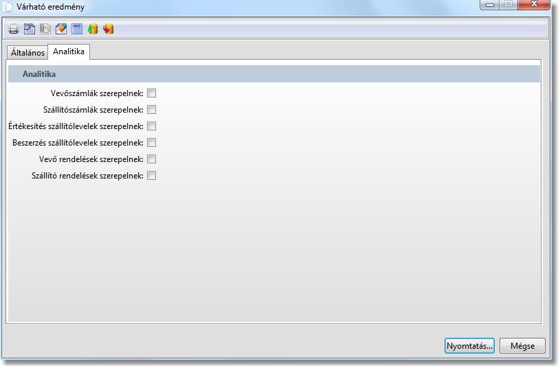 A funkcióval az analitikákból számítható várható eredmény listázható. A listában a rendelések / szállítólevelek / számlák szerepelnek mindig úgy, hogy az adott bizonylatból csak a nyitott részt mutatja a lekérdezés. Ha egy szállítólevél pl. nincs számlázva akkor megjelenik, de ha egy része már számlázva van (számlához van kapcsolva), akkor az a rész nem szerepel a listában, mert ebben az esetben a számla szerepel.