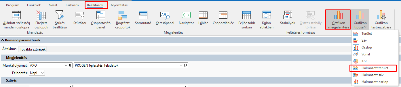 A halmozott áramlásdiagramot az eredményhalmaz lekérdezéssel előállított darabszámokból a Beállítások / Grafikon megjelenítése / Grafikon típusa = Halmozott terület beállítással készíthetjük el: