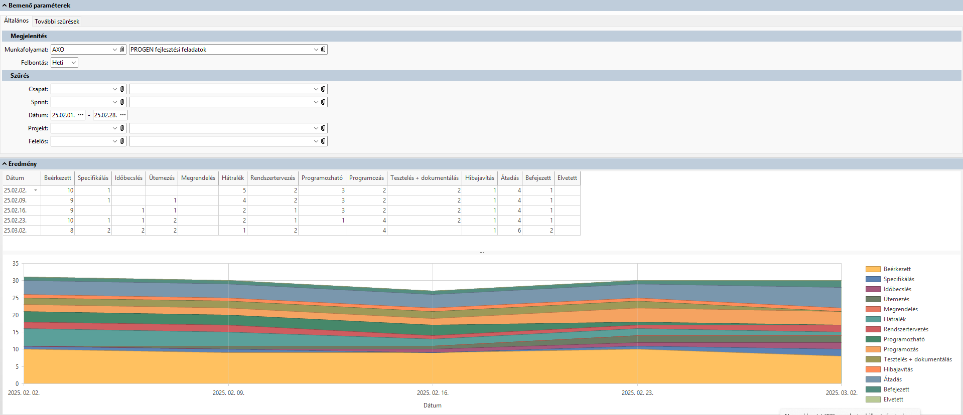 Ezzel a lekérdezéssel napi / heti / havi bontásban készíthetünk egy eredményhalmaz-lekérdezést, ami tartalmazza egy adott munkafolyam állapotaiban a nap, hét vagy hónap végi feladatok darabszámát.