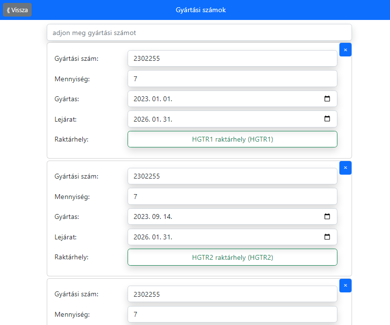 Abban az esetben ha vonalkód olvasás során olyan terméket vételeznénk be amely gyártási számos és további adatot is szükséges megadni (gyártás dátuma, lejárat dátuma), azonban a vonalkód olvasással csak a termék vonalkódját olvastuk le, akkor a következő képernyőképen látható oldalon további vonalkód beolvasásával megadhatóak ezek a további adatok.