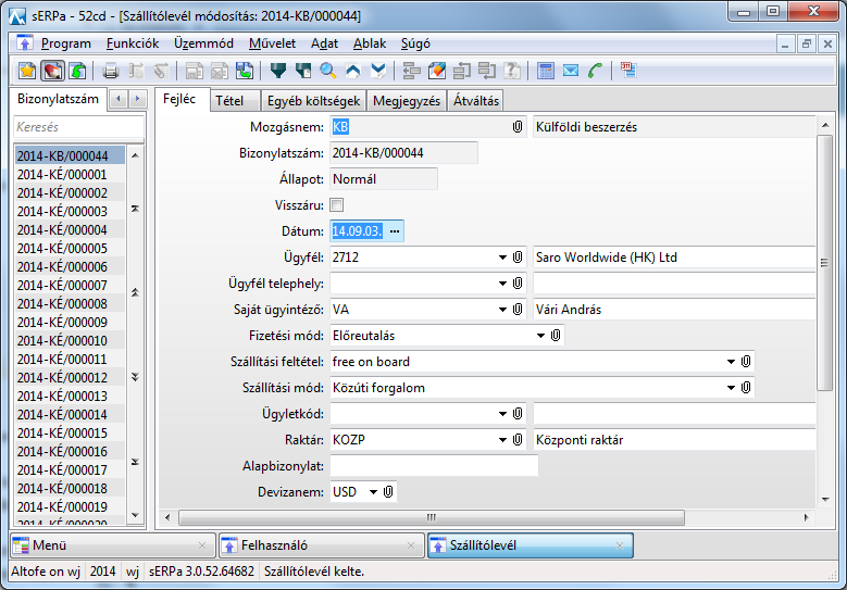 A sERPában létrejövő szállítólevél fej adatai kitöltődnek a szállító rendelés és a beállított paraméterek alapján.