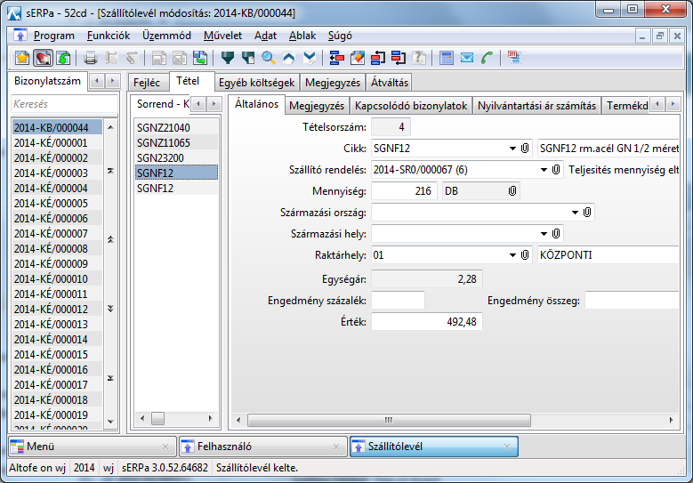 A tétel adatok hivatkoznak a szállító rendelés tételekre. A többletet úgy kezeli a program, hogy a szállítólevél tételben a 'Teljesítés mennyiségi eltérés esetén is' mezőt igazra állítja. Ezzel a rendelés is teljesül és a többlet mennyiség is bekerül a raktárba.