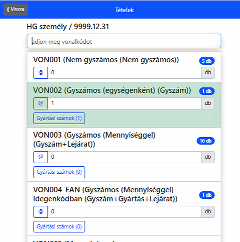 Ebben az esetben a program minden beolvasás esetén az olvasott terméket külön sorba helyezi a Gyártási számok képernyőn és a frissen beolvasottat helyezi legfelülre.