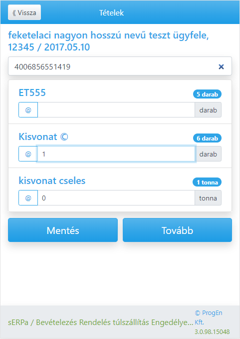 Amikor az összes hozott áruval végzett, akkor a raktáros megnyomja a "Tovább" gombot.