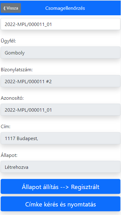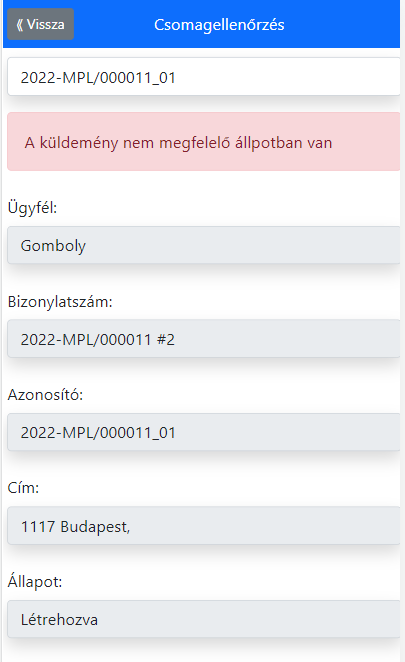 Ezekbe a mezőkbe nem tudunk direkt írni. Az alsó gombok segítségével állapotot tudunk változtatni, illetve címkét kérni és nyomtatni. Ha a vonalkódolvasóval kétszer olvassuk le ugyanazt a csomagot, az állapot a menüparaméter szerint változik meg. Amennyiben nem a menüparaméternek megfelelő állapotban van a csomag, abban az esetben üzenetet figyelmeztetést kapunk arról.