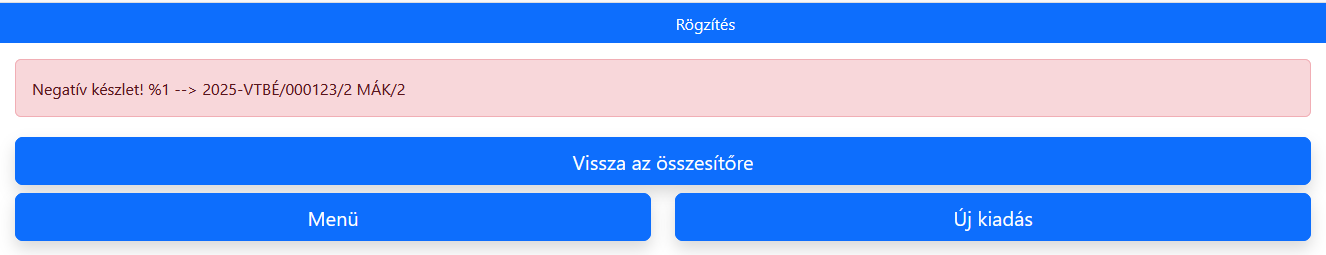 Vannak azonban olyan funkciók (bevételezés, kiadás, értékesítés, áttárolás), ahol a hibás rögzítést követően vissza tud lépni a felhasználó az előző oldalra (pl.: kiadás funkcióban, hogyha többet szeretnénk kiadni, mint amennyi készleten van, akkor megjelenik a vissza az összesítőre gomb is). Ilyen esetben nem történik használati idő rögzítés, csak akkor hogyha sikeres a bizonylat rögzítése:
