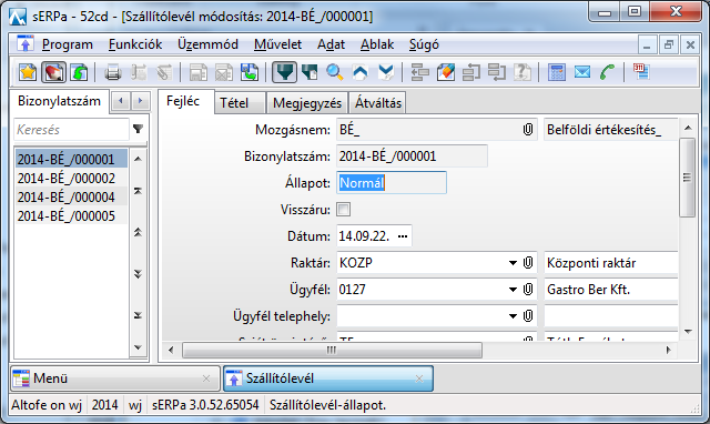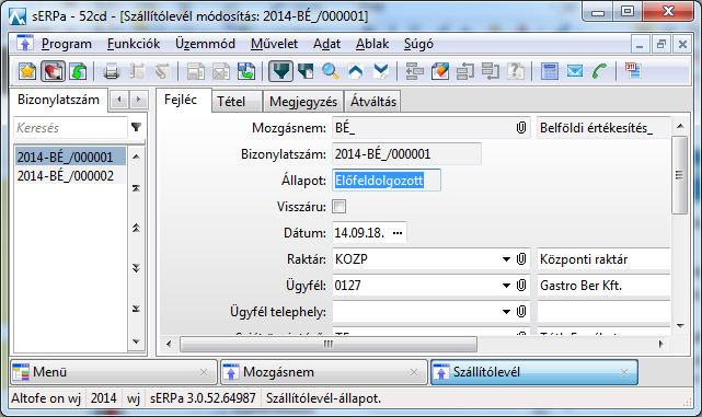 Az eredetileg "Előfeldolgozott" állapotból ellenőrzés után a sERPa-ban "Normál" állapotúvá változik a szállítólevél, valamint a Dátuma lemódosul a mai napra.