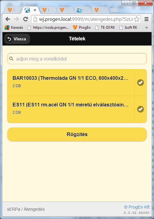 A leellenőrzött és le vonalkód olvasott gyártási szám, vagy cikk-re áll a fókusz, beszínezi a sort, amivel jelzi, hogy ellenőrzésre került. Az összes sor sikeres ellenőrzése (teljes egyezés) után lehet rögzíteni, azaz csak az előfeldolgozott szállítólevéllel fizikailag teljes mértékben egyező tételek alapján történhet meg a raktáros részéről az elfogadás.
