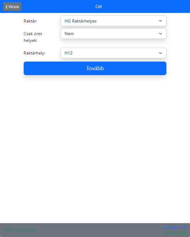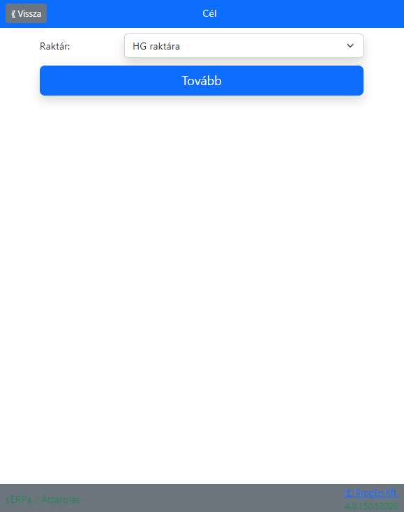 Forrás raktár választásakor, abban az esetben ha raktárhelyes (de nem egyéb alábontásos) raktárat választottunk és a raktárhely vonalkódját vonalkódolvasóval azonosítottuk, a felület automatikusan a Termék választás képernyőre navigál. Ha nem találtuk meg vonalkóddal a raktárhelyet vagy a raktár egyéb alábontásos, akkor az adatok megadása után a felhasználónak kell rákattintani a Tovább gombra.
