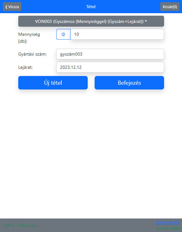 Amennyiben további tételt is szeretnék rögzíteni az "Új tétel" gombra kattintva az előző képernyőre jutunk, azonban az itt megadott termék (és gyártási szám) bekerül a kosárba.
