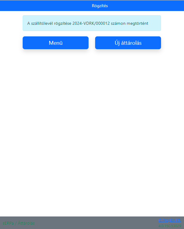 A rögzítés gombot megnyomva raktárközi szállítólevél készül a sERPában, amelynek a sikeres felvételéről a bizonylatszám megjelenítésével tájékoztat a program.