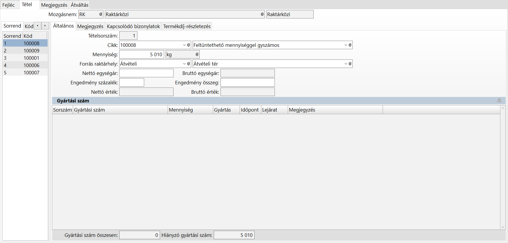 Gyártási számot úgy kezel a funkció, hogy a kötelező gyártási számos termékek készletét gyártási számonként külön soron hozza, így külön rendelkezhetünk az egyes gyártási szám mennyiségek áttárolásáról.