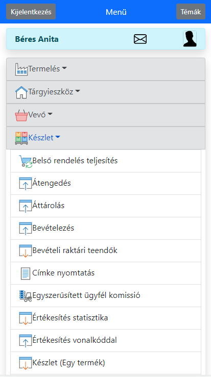 Ilyenkor a kiadást végző munkatárs a mobil eszközén kiválasztja a "Belső rendelés teljesítés" menüpontot.