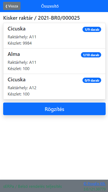 Az összeszedett termékekről összesítő lista jelenik meg, ha a "Tovább" gombra nyom a kezelő.