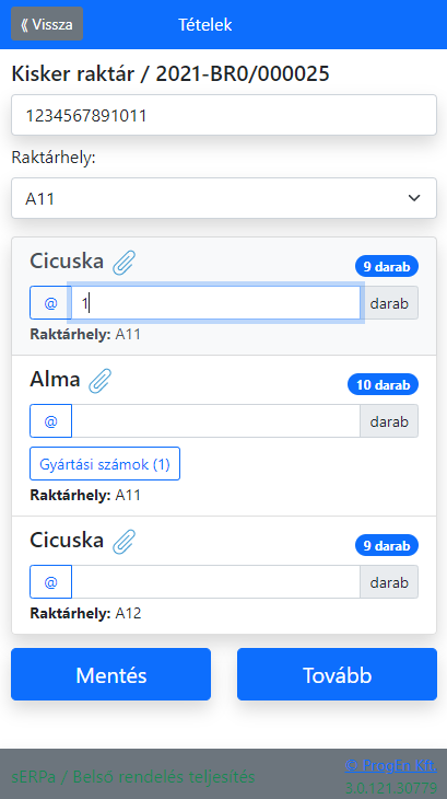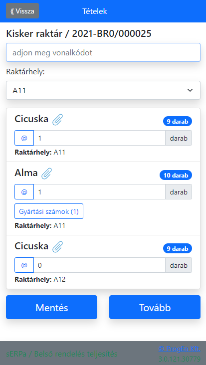 A kiadandó terméket megkeresve, vonalkódról leolvasva, a képernyőn a fókusz a rendelés tételei közül a megfelelőre áll (raktárhelynél a korábban kiválasztott raktárhelyen belül) és az "Összekészített" mezőben lévő mennyiség megnő annyival, amennyi a vonalkódban szerepel. Természetesen itt a mennyiség kézzel is növelhető. A készletnél nagyobb mennyiség viszont nem adható meg - kivéve a megfelelő menüparaméter beállításával.