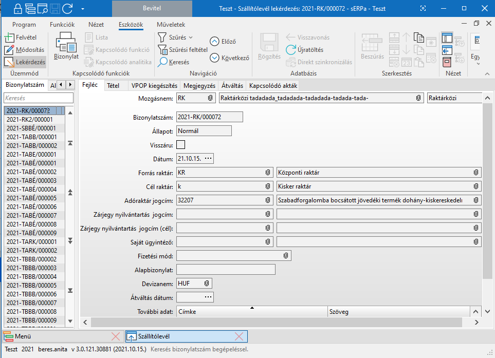 A sERPában létrejövő szállítólevél fejléc adatai kitöltődnek a belső rendelés és a beállított paraméterek alapján. A Raktár funkció / Rendelés-nyilvántartás fül / Kiadás keret / Belső rendelés teljesítés mozgásnem mező határozza meg a mozgásnemet. (A rendelés relációja alapján.)