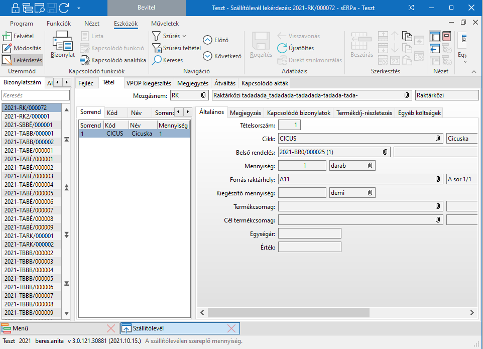 Itt a "Rögzítés" gomb megnyomására megtörténik a sERPába az átadó raktárhoz tartozó belső rendelés teljesítse mozgásnem típusú szállítólevél rögzítése, ami lemozgatja a készletet és teljesítetté teszi a belső rendelést. A rögzítéskor létrejövő bizonylat azonosítójáról a megjelenő ablakban tájékozódhatunk.
