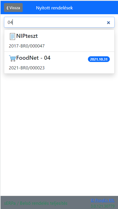 A "Szűrés" mezőbe beírható a raktár név része, vagy a rendelésszám része és akkor a megadott karakterek szerint szűkítve jelennek meg a választható rendelések.