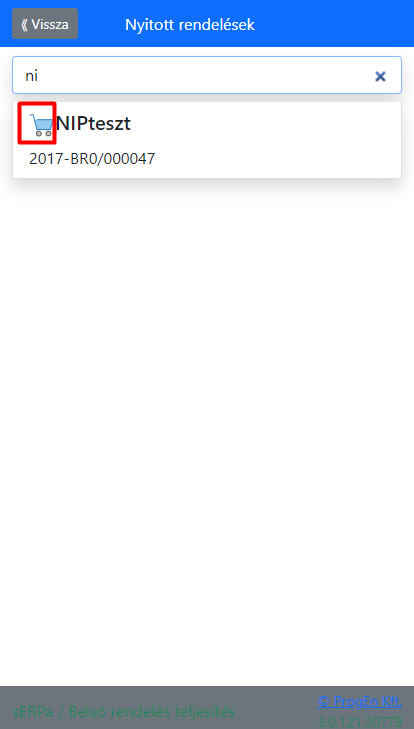 A belső rendelés teljesítés folyamat megszakítható, ilyenkor mentést kell nyomni. Ekkor a teljesíés még nem történik, hanem a félbehagyott teljesítés lesz folytatható, ha ismét belép a kezelő a Kiadás menüpontba. Ezt a rendelés ikonjával jelezzük, mely egy bevásárlókocsi lesz, ha van már mentésünk.
