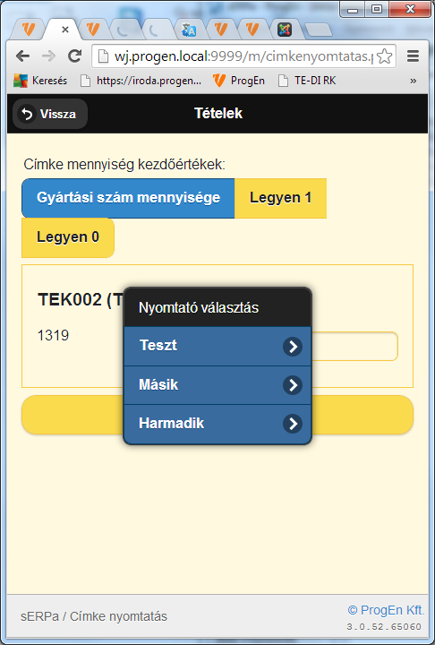 Minden tétel mellett megjelenik a Címkemennyiség, amelybe "Tételenként 1 db" beállítás esetén benne van az 1, ami felülírható. "Tételenkénti címkemennyiség" választása esetén a Címkemennyiségben a gyártási szám szerinti mennyiség kerül be kezdő értékként. Nulla választása esetén minden tétel mellett kinullázódik a Címkemennyiség.
