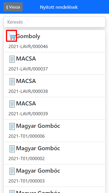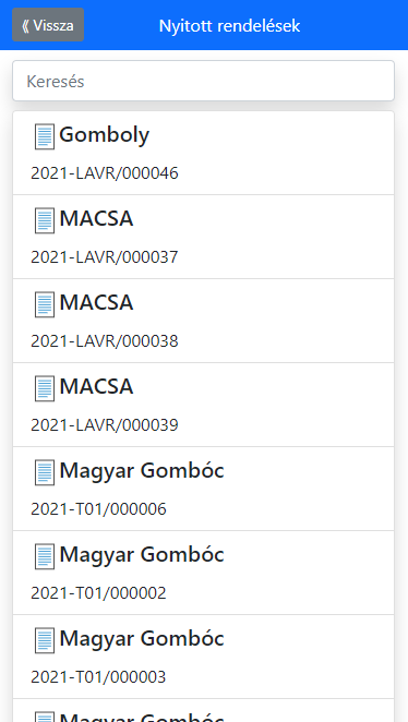 A megjelenő "Nyitott rendelések" oldalon ki kell választani a ügyfelet és a rendelését, amelyet el szeretne vinni. A rendelések alapbeállítás szerint a lenti módon jelennek meg bizonylatonként: