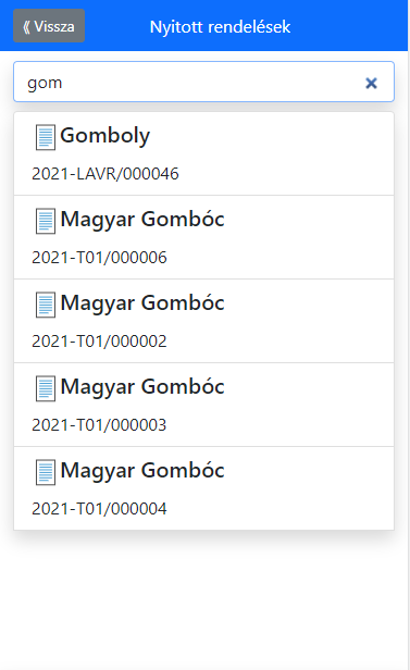 A "Szűrés" mezőbe beírható az ügyfélnév része, vagy a rendelésszám része és akkor a megadott karakterek szerint szűkítve jelennek meg a választható rendelések.