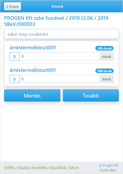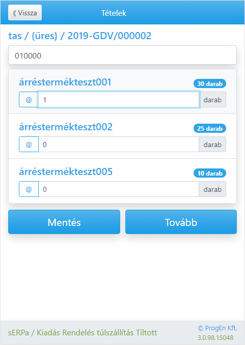 A kiadandó terméket megkeresve, vonalkódról leolvasva, a képernyőn a fókusz a rendelés tételei közül a megfelelőre áll (raktárhelynél a korábban kiválasztott raktárhelyen belül) és az "Összekészített" mezőben lévő mennyiség megnő annyival, amennyi a vonalkóddal meg van adva. Természetesen itt a mennyiség kézzel is növelhető. A készletnél nagyobb mennyiség viszont nem adható meg. Ha a raktárhelyet vonalkóddal olvassuk le, akkor azt is átváltja a program és folytatódhat a kiadás az újonnan le vonalkód olvasott raktárhelyről.