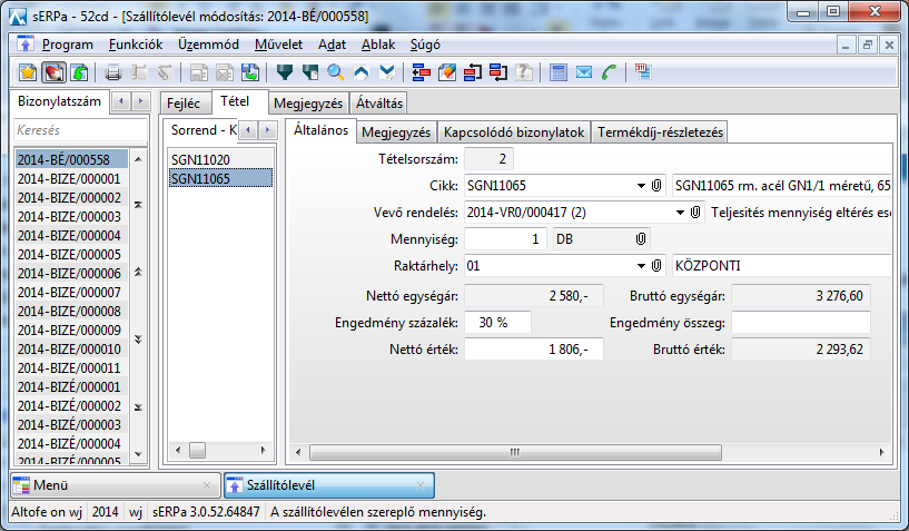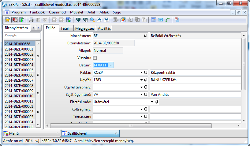 Itt a "Rögzítés" gomb megnyomására megtörténik a sERPába az Értékesítés típusú szállítólevél rögzítése, ami lemozgatja a készletet és teljesítetté teszi a vevőrendelést. A rögzítéskor létrejövő bizonylat azonosítójáról a megjelenő ablakban tájékozódhatunk.