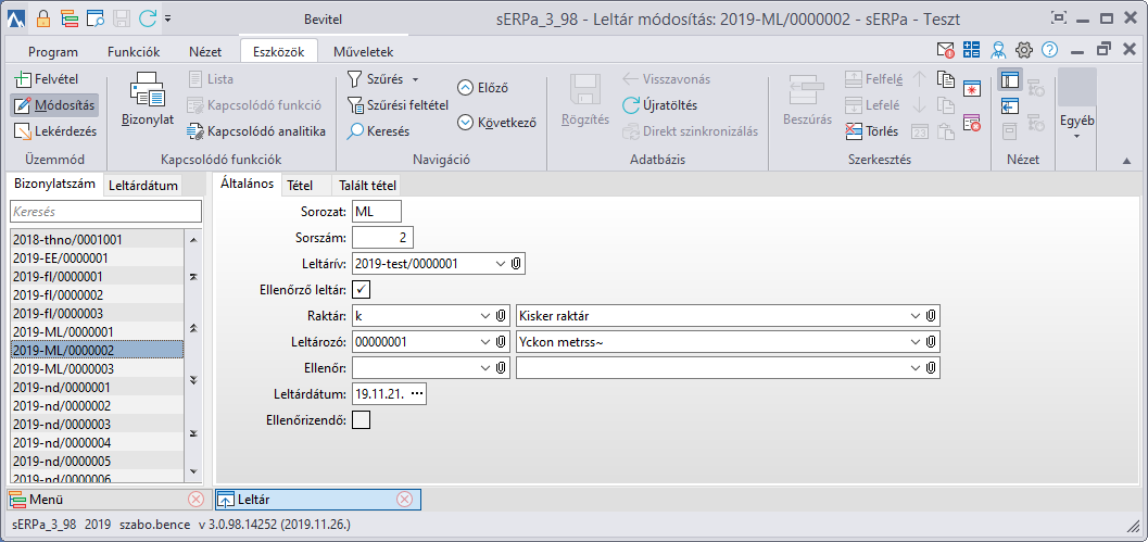 Előzetesen a sERPa Készlet moduljának Leltár funkciójában fel kell venni egy Leltár bizonylatot.