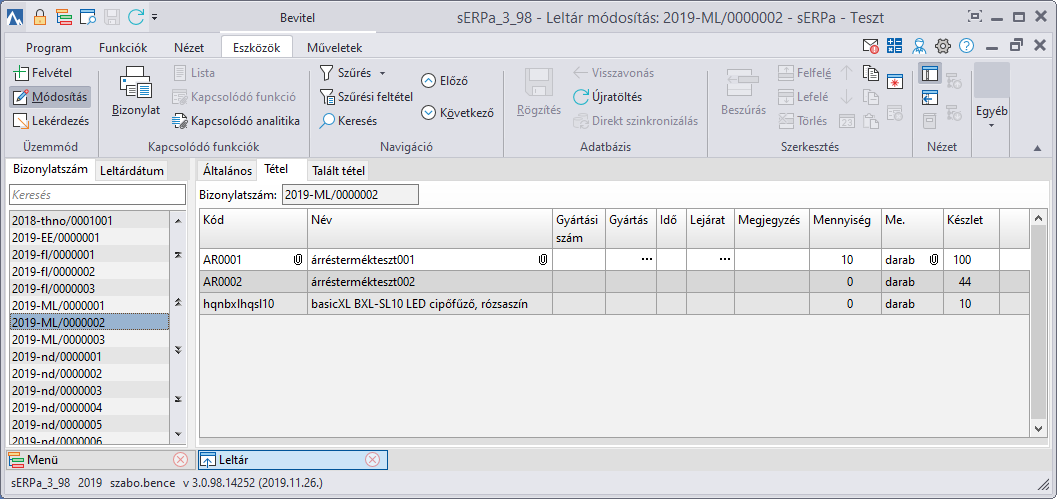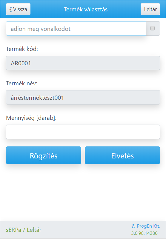 Rögzítést nyomva elmentődik a sERPa Leltár funkciójának Tétel oldalára a termék a megadott mennyiség és, ha meg volt adva, akkor a gyártási szám.
