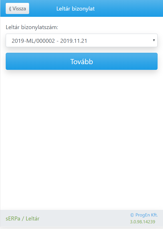 Az első oldalon ki kell választani a leltár bizonylatszámát (a bizonylatszám után kiírásra kerül a leltár dátuma és a legfrissebb dátumú kerül a választómezőbe legfelülre) amihez tételeket akarunk rögzíteni. (7 napnál régebbi bizonylat nem választható ki)