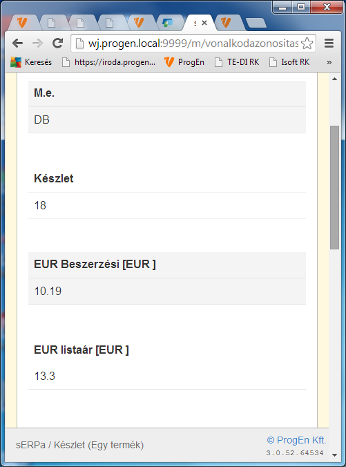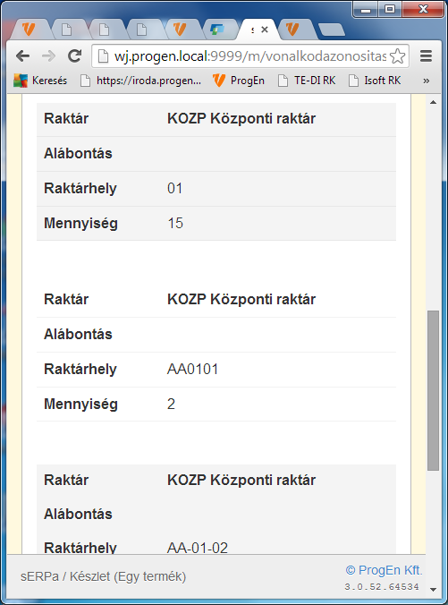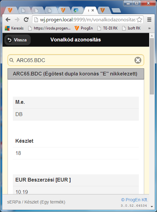 A mobil eszközön látható adatok a sERPa készlet lekérdezés funkciójában látszanak.
