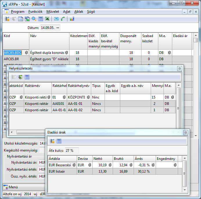 Megnézhető, hogy a különböző készletpozíciókban mennyi van a cikkből. Mennyi van lefoglalva (Diszponált) és mennyi a szabad készlet.