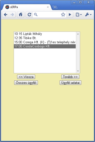 A megjelenő ablakban soronként jelennek meg a meglátogatandó partnerek. Egy-egy sorban megjelenik az időpont, amikor ott kell lenni az ügyfélnél, mellette pedig az ügyfél megnevezése.