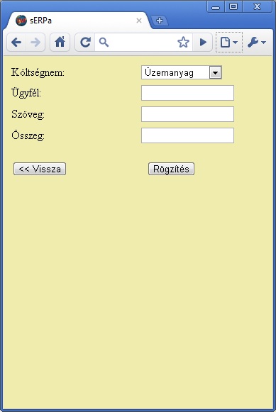 A költségelszámolás gomb megnyomására a megjelenő ablakban kiválasztható, hogy milyen típusú költséget kell elszámolni (Üzemanyag / Telefon / Szálloda). Megadható az ügyfél neve, akinek a számláját el akarjuk számolni, valamint az elszámoláshoz a szöveg és az elszámolandó összeg (bruttó). A "Rögzítés" gomb megnyomására a sERPában generálódik egy pénztárbizonylat (a mozgó értékesítés paraméter funkcióban megadott pénztárban). "A rögzítés rendben megtörtént." üzenet tájékoztat a rögzítés sikerességéről. A pénztárban a mobil értékesítés paraméter funkció költségelszámolás fülén a költségnem táblázatban definiált típusú bizonylat keletkezik a megadott bruttó összeggel, ügyféllel, szöveggel (Egyéb bevétel és Egyéb kiadás esetben a szövegbe beírt ügyfélnévvel.) a folyó dátummal.