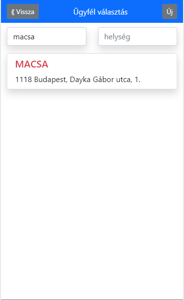 Ha kiválasztottuk a funkciót, az Ügyfél választás oldalon találjuk magunkat. Itt beírhatjuk az ügyfél nevét/kódját, illetve helyiség alapján is kereshetünk.