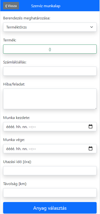 Miután kiválasztottuk az ügyfelet, és ha arra van lehetség, annak telephelyét, a Szerviz munkalap oldalon vihetünk be munkavégzéssel kapcsolatos adatokat. A Berendezést kötelezően meg kell adni. Amennyiben szöveges berendezést adunk meg, akkor Berendezés megadáshoz csak a szöveget kell beírnunk. Ha Terméktörzset, akkor a Termék választás oldalra jutunk, ott választunk. Ha Berendezéstörzset, akkor a Berendezés választás oldalon választhatjuk ki az általunk használni kívánt berendezést. Minden esetben választás után visszajutunk a Szerviz munkalap oldalra. Innen az Anyag választást kiválasztva jutunk az anyag választásának lépéshez.