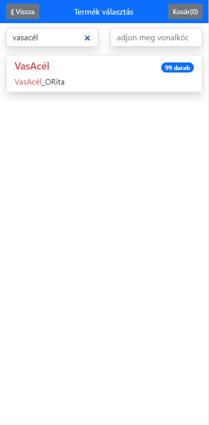 A Termék választás oldalon kereshetjük meg a terméket, mely az anyagnak felel meg.A termékeknél látható mennyiség az Anyagfelhasználás mozgásnemben megadott raktár készletét mutatja, nem figyelve raktárhelyet és egyéb alábontást.
