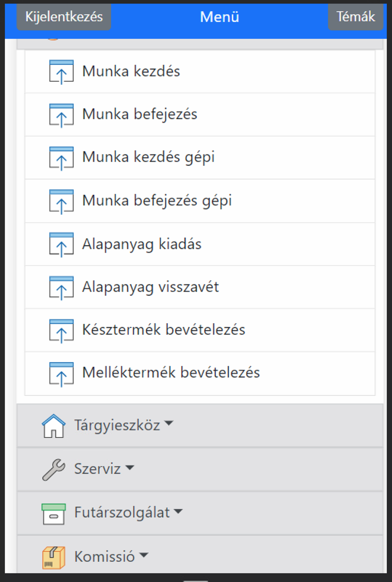 Az alábbi üzenetek érkezhetnek: - Kezdhető (munkalap Gyártható / Megkezdett állapotban van) - A munka már folyamatban van (van befejezetlen művelet kezdés) - A munkalap nincs Gyártható / Megkezdett állapotban - A művelet Befejezett állapotban van. - A művelethez nem lehet munkaidőt rögzíteni (Termeles.Muvelet Gép = FALSE és Munkaerő = FALSE) - A mobil eszközre bejelentkezett Felhasználó nem szerepel Munkaerő-ként - Nincs minden minőség-ellenőrzési tulajdonság kitöltve. - Nem létező művelet azonosító - Zárol munkalap / munkalapművelet: Ütemezés által vagy minőség-ellenőrzés általi zárolás. |