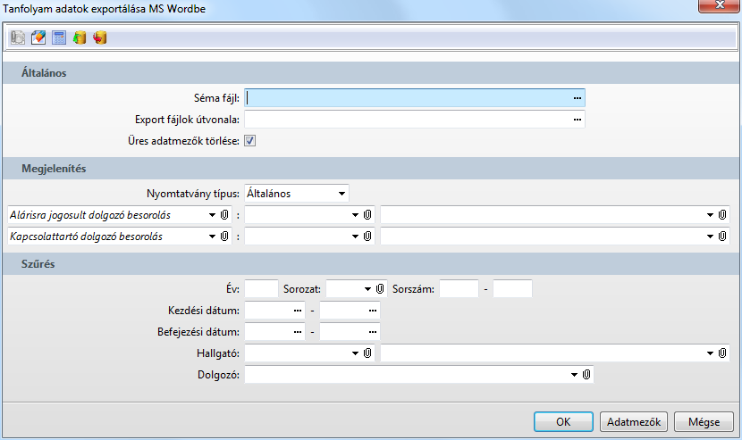 A "Séma fájl" mezőbe beírt *.doc fájl által meghatározott módon történik az export.(Sablonfájllal kapcsolatos további információk)
