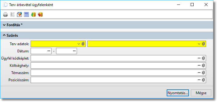 Ügyfelenkénti terv árbevétel és a terv ráfordítás összehasonlítására szolgáló, továbbszámolásra alkalmas kizárólag táblázatos excel kimenetet adó listázó funkció. Alapértelmezett beállításoknál, ha a dátum szűrés nincs kitöltve, akkor az adott tárgyévre történik a szűrés, tehát a szűrés pillanatában a rendszerdátum szerinti év kezdetétől az év végéig. A listában csak azok az ügyfelek jelennek meg, amelyekhez a szűrésben szereplő dátum intervallumban van projekt, és a terv árbevétel, vagy terv ráfordítás, a lista lekérésének időpontjában számított tárgy évre tartalmaz adatot.