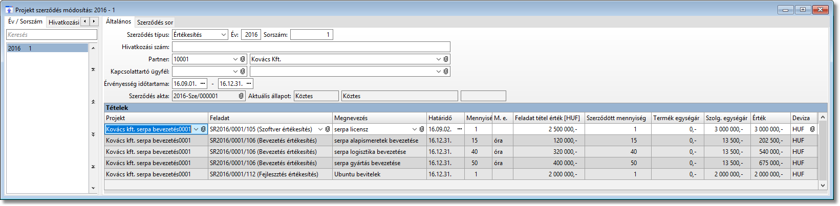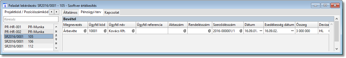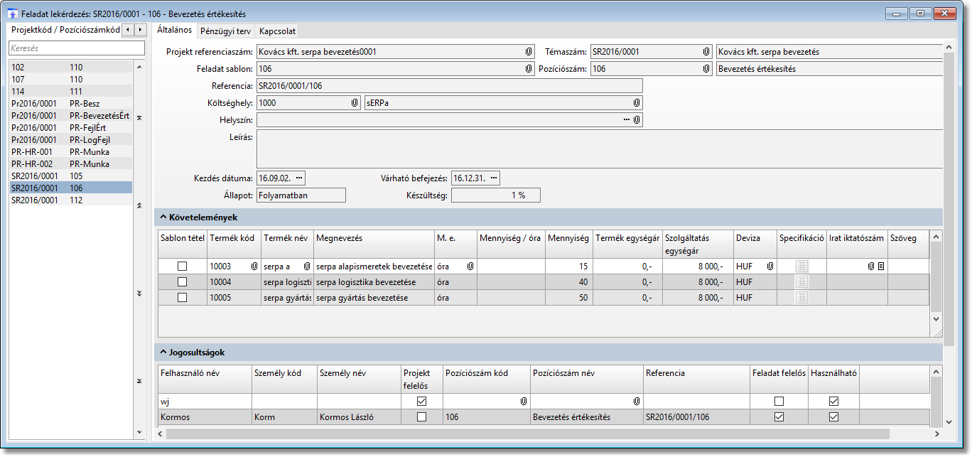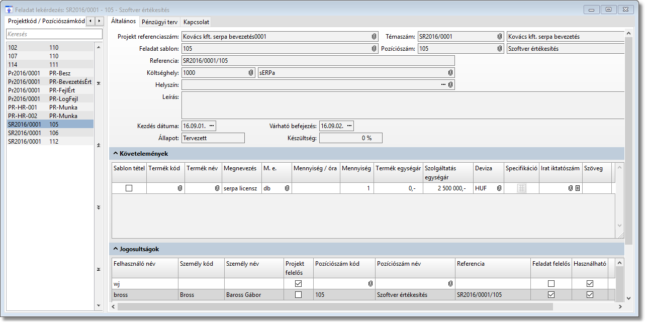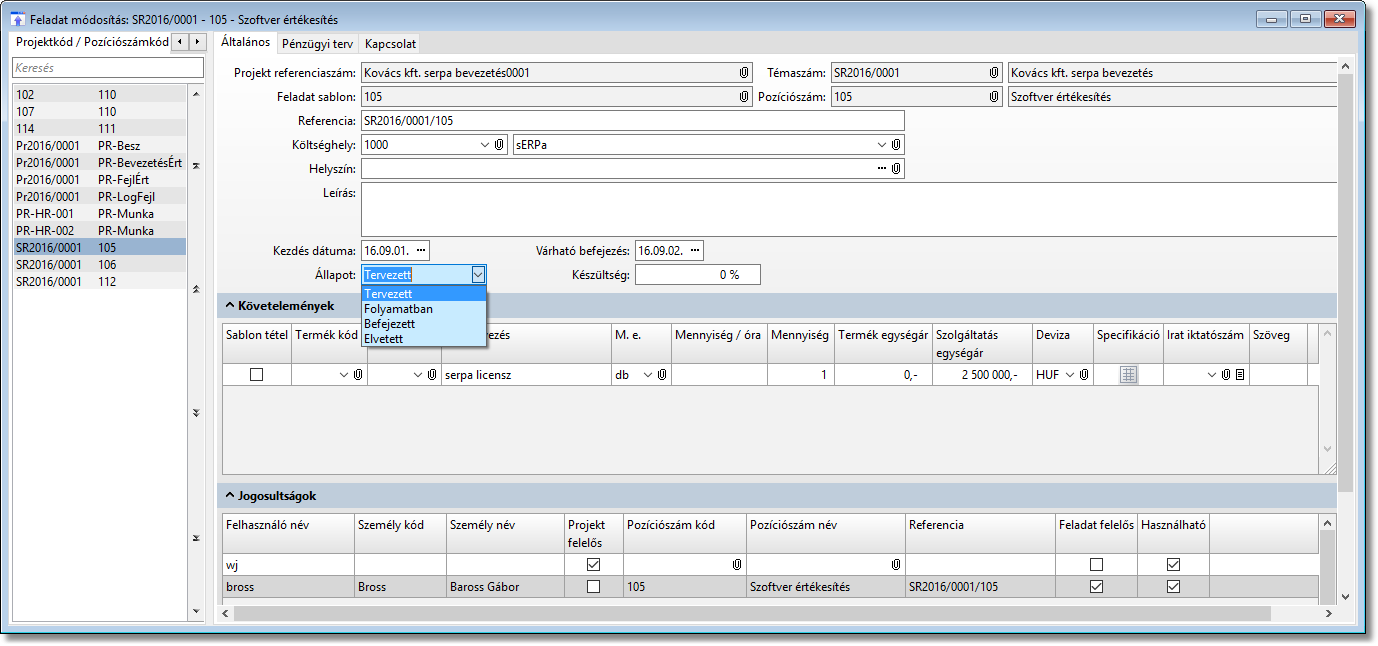 A folyamatban lévő állapotra váltásával, valamit a feladat elmentésével máris legenerálódtak a tervadatok. Mivel a feladatnak egy követelménye van, ami 2 500 000 forint értékű serpa licensz, és egy pénzügyi terve a szerződés szerint, ami 3 000 000 forintos árbevétel, ezért a tervadat is ebből a két értékből generálódott külön sorban, ahogy az alábbi képeken látszik.
