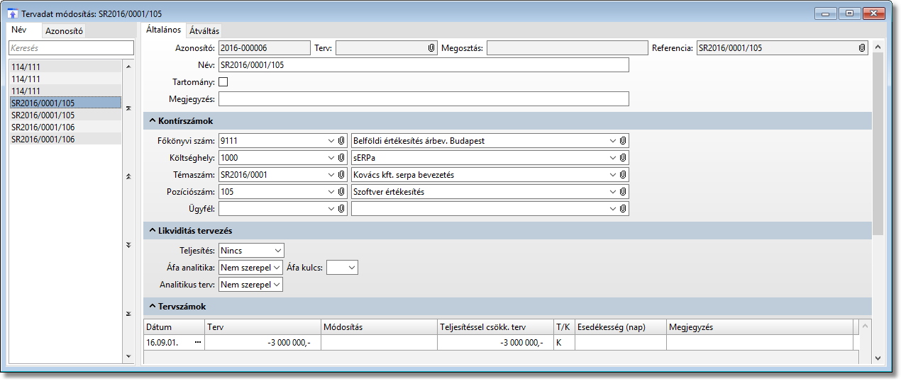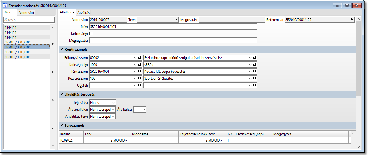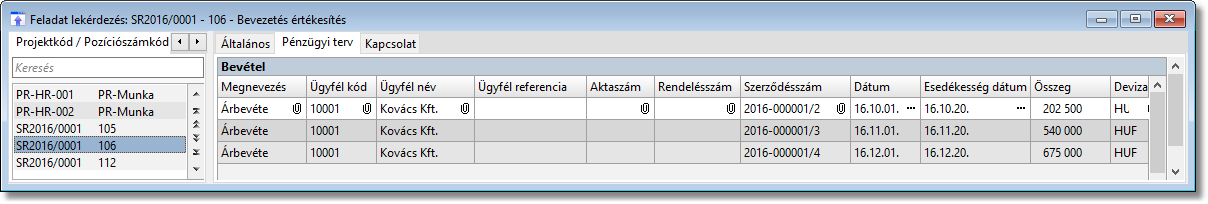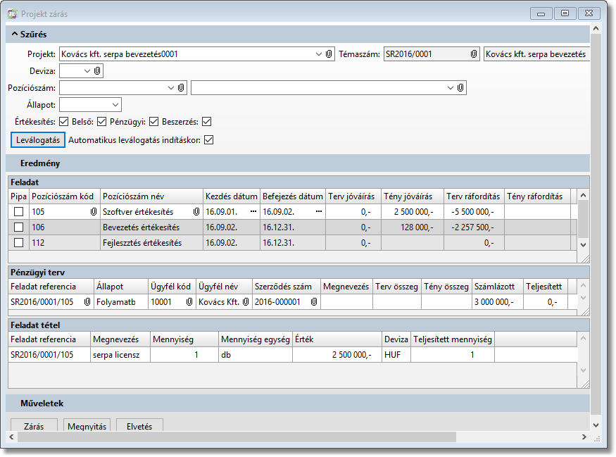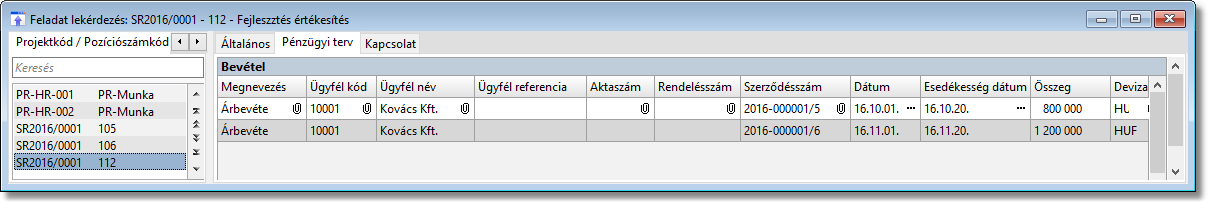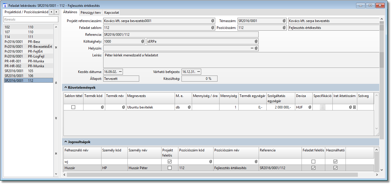 A folyamatban lévő állapotra váltásával, valamit a feladat elmentésével máris legenerálódtak a tervadatok. Mivel a feladatnak egy követelménye van, ami 2 500 000 forint értékű serpa licensz, és egy pénzügyi terve a szerződés szerint, ami 3 000 000 forintos árbevétel, ezért a tervadat is ebből a két értékből generálódott külön sorban, ahogy az alábbi képeken látszik.