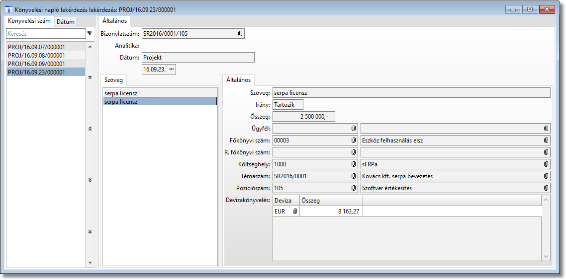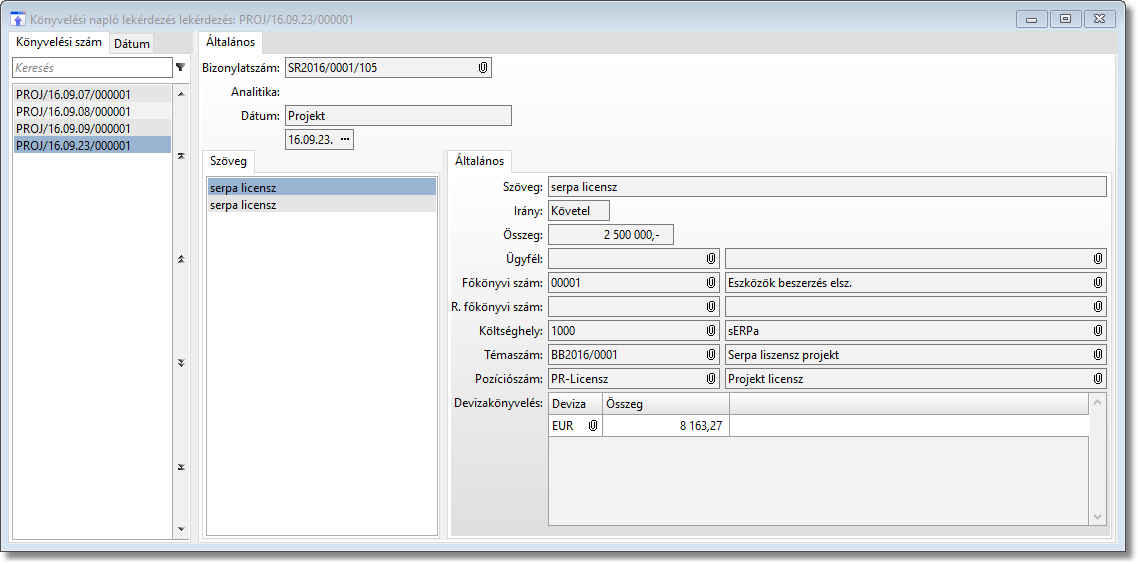 A teljesítés mentésével egyidőben a főkönyvben is megjelennek az előre beállított főkönyvi számon a feladott feladat tételek.