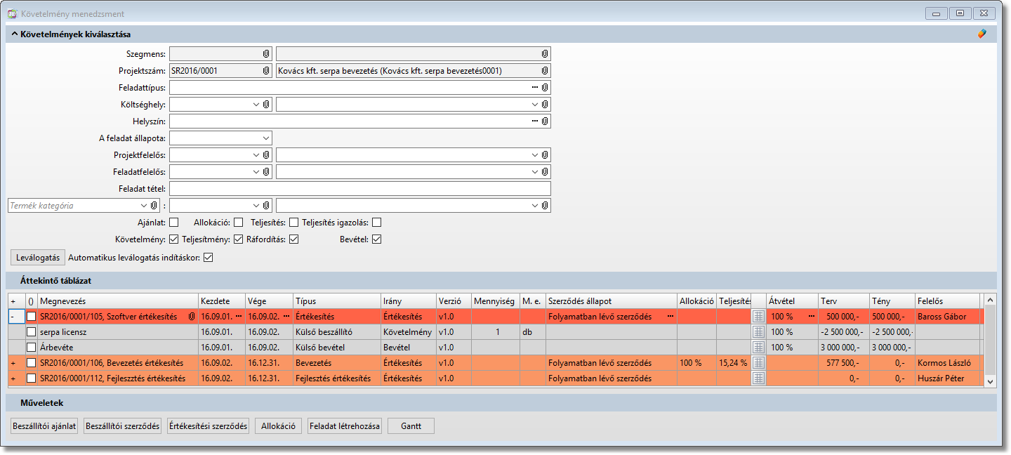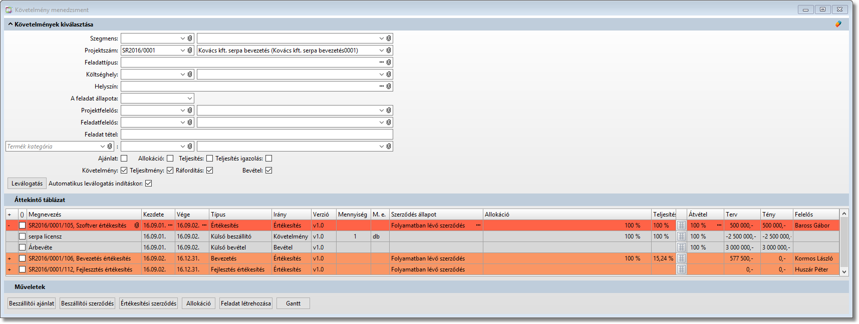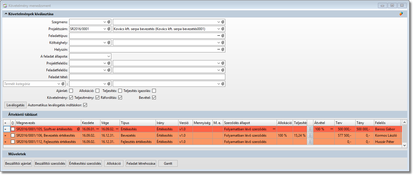 Teljesítmény típusú feladatot jelen esetben azért nem kellett felvenni, mivel azt már megtettem a Projektkezelés modul bevezetésének módszertana a vállalatnál, amikor a belső erőforrásaimat felvettem. A követelmény típusú feladatok felvétele után már látni lehet, hogy az automatikus allokáció segítségével a belső erőforrásaimhoz kapcsolta a követelményeimet a rendszer. Ezt akár le is tudom ellenőrizni a Követelmény menedzsment funkció segítségével: