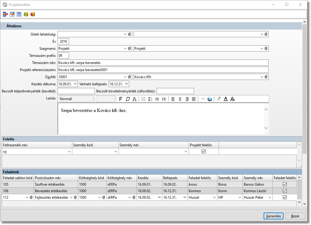 A projektem felvételét a Projektindítás funkció segítségével végzem el, ahol beállítóm az Évet, a szegmenst (a szegmens attól függ mit veszek fel, projekt szegmensnél projektet veszek fel, eszköz szegmensnél tárgyi eszközt, és HR szegmensnél munkást), a témaszám prefixet, ami a projektszám első karaktereit teszi ki, a témaszám nevet adhatom meg, valamit a projekt referenciaszámot, ami egyedileg azonosítja a projektet (a projekt referenciaszám egyedi érték lehet, két projekt esetén nem adhatom meg ugyanazt a szövegkódot), az ügyfelet, valamit a dátumtartomány, hogy a projektet mikortól, meddig tervezem. A leírás mezőben tudok részletes leírást készíteni a projekthez. A projektfelelőst a leírás alatti táblázatban adhatom meg, ami nem kötelező, de akár több felelőst is adhatok meg a projekthez. A projekt felelősök jogot kapnak a projekt bármely részében bármit módosítani, valamit a serpa menüjükben szereplő összes modul összes funkciójában témaszám / pozíciószám alapján azonosított a projekthez tartozó bizonylatokat láthatják. A projekt felelősöket, amikor felvettem, akkor az alatta lévő táblázatba tudom a már említett három feladatot beállítani, és a feladatok időtartalmát, divíziójukat, és felelősük felvenni. A feladat felelősök hasonló jogot kapnak, mint a projekt felelősök, csak ők nem az egész projektet, hanem a projekt egyes részeit, azaz feladatait tudják módosítani, és szintén láthatják a hozzájuk tartozó bizonylatokat az egész sERPában.