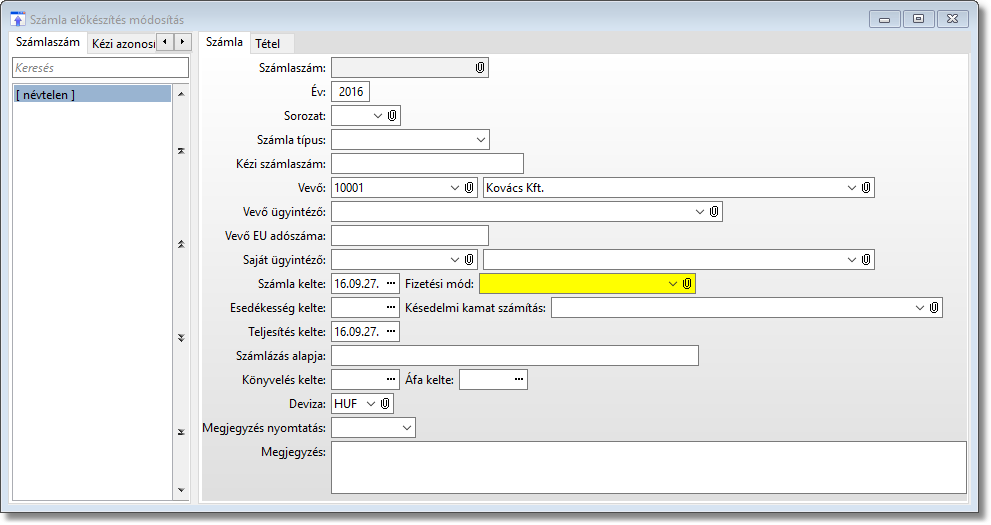 A Számla előkészítés funkciót megnyitva látszik, hogy bekerült egy "[névtelen]" nevű előkészítés. A következő képen látszik: