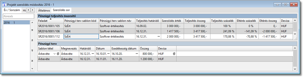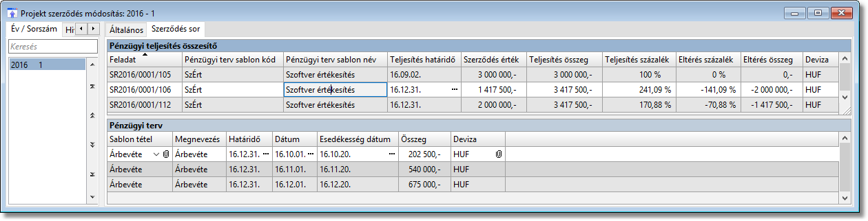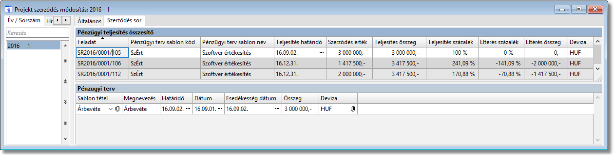 A szerződés második fülére, azaz a Szerződés sor fülre váltva látni lehet a pénzügyi teljesítés összegző ahol a három feladatot látom, bármely feladatra állva tudok pénzügyi tervet készíteni.