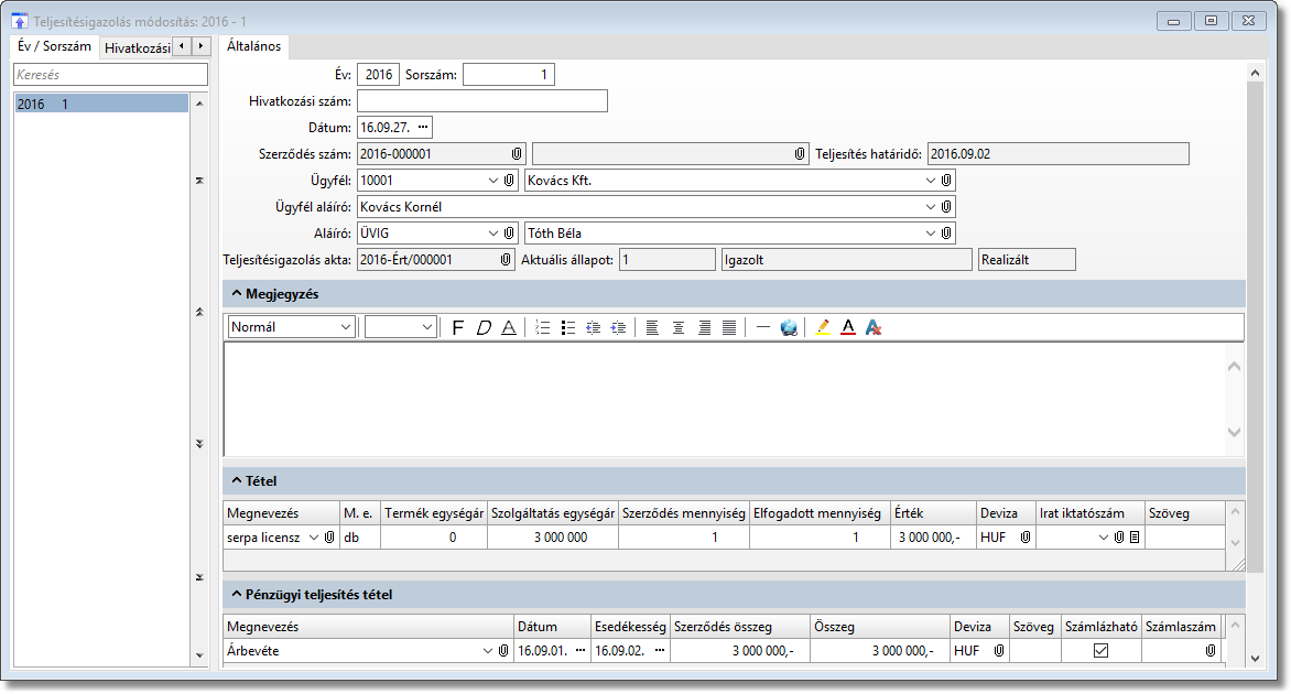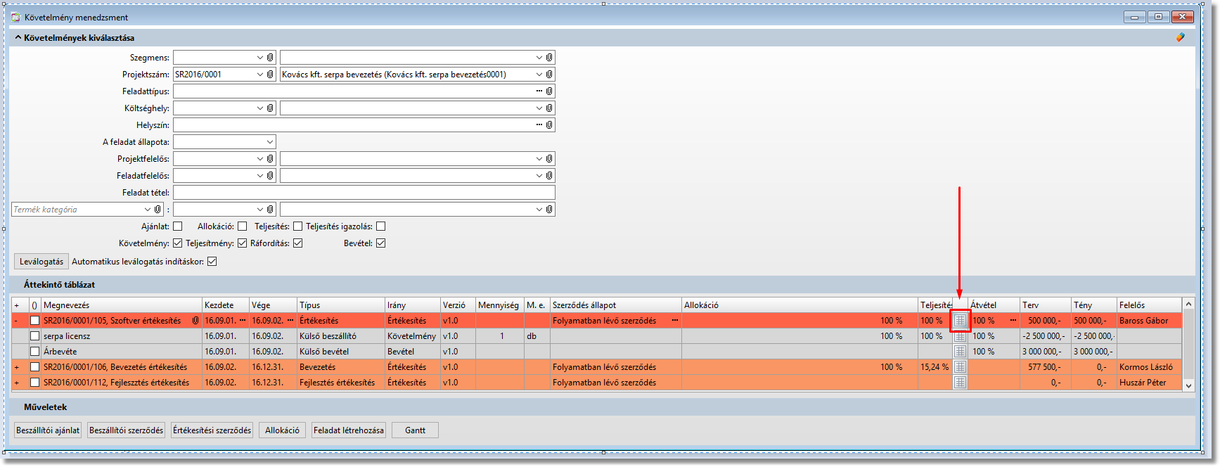 Látható, hogy két feladat tételünk van, az első a feladat követelménye, a második a bevétel amit a szerződés segítségével vettünk fel, és a rendszer automatikusan a feladathoz kapcsolt. A követelményeket tudjuk belső munkánkkal teljesíteni úgy, hogy a Teljesítés oszlop, és Átvétel oszlop közötti kis rács alakú ikont megnyomjuk. Ekkor feljön a teljesítés táblázat: